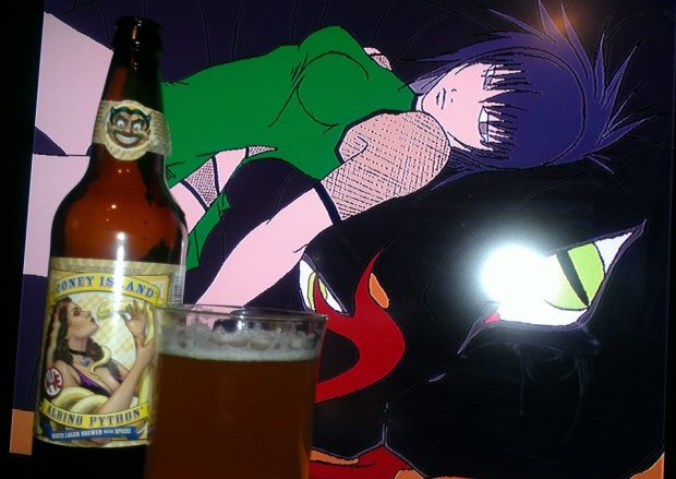 The Coney Island Albino Python was a beer recommended by my friend Rich. A lager type beer made with hops, malts and spices including ginger, fennel, and orange peels. I must say this is very close to a heffeweizen but not as heavy. Never the less this beer is delicious and refreshingly great. Starts of with a rush of flavors coming from the ginger and oranges. The malts are felt throughout and the finish leaves with a nice bitterness from the hops. I enjoyed this beer alot and would recommend it as well. LOL I wonder if they sell this in a six pack 😛