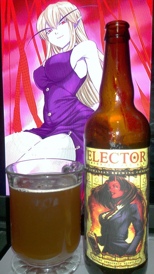Elector Imperial Red Ale by New Albanian Brewing is an Amber ale at 7.0% ABV. This beer was made on election day for the elections. Yesterday was the Primary California Election and it is interesting how they like to compare this strong ale to that of the election system. A system in which democracy becomes pointless in the sense of severing party affiliations, commanding people to vote early and vote often. The beer is basically saying that when it comes to truly making a choice of who to vote for, whether for candidates, laws, propositions or in this case, beer, then there is no better choice. As far as amber ales got, it is a good beer for sure. Mixing a great amount of hops with rich malts. We get flavors of pine, citrus and grass which blend with toffee, caramel, hazelnut, and minor bitter dark chocolate. There is also some nice cherry, raisin and biscuit bread sweetness like other amber ales. Some rum after taste with cherry lingering. A lot of amber ales tend to focus on different aspects, like for example, Fat tire focuses on chocolate and caramel biscuit while Tongue Buckler has a lot more cherry. This beer is actually more of biscuit, hazelnut, citrus and cherry appeal. While amber ales aren’t often my preferred style, this beer is pretty good for those that like amber beers.