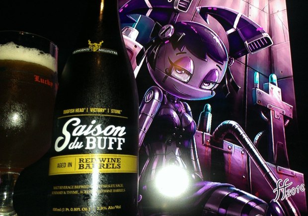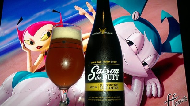 Saison du Buff Aged in Red Wine Barrels is the aged collaborative brew of the Beer Epics, Stone, Dogfish Head and Victory Brewing. It is a 7.9% ABV Saison/Farmhouse ale. This one though, Stone decided to be evil and age it in Red Wine Barrels by Stone. Stone…you sure come up with some awesome ideas 😀