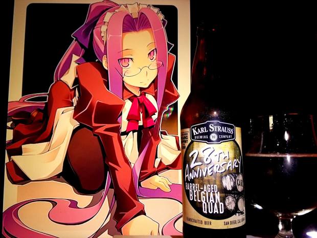 Rider from Fate Stay Night series was used in this pairing as I had used her in the previous Karl Strauss anniversary which I did not do a review of but this time around I wanted to bring her back. She represents the colors of the dark fruits which generally are a prominent flavor with these beers but also since she is powerful like the way this beer is strong in ABV. In general, the dark and barrel aged theme of the beer goes well with this one.