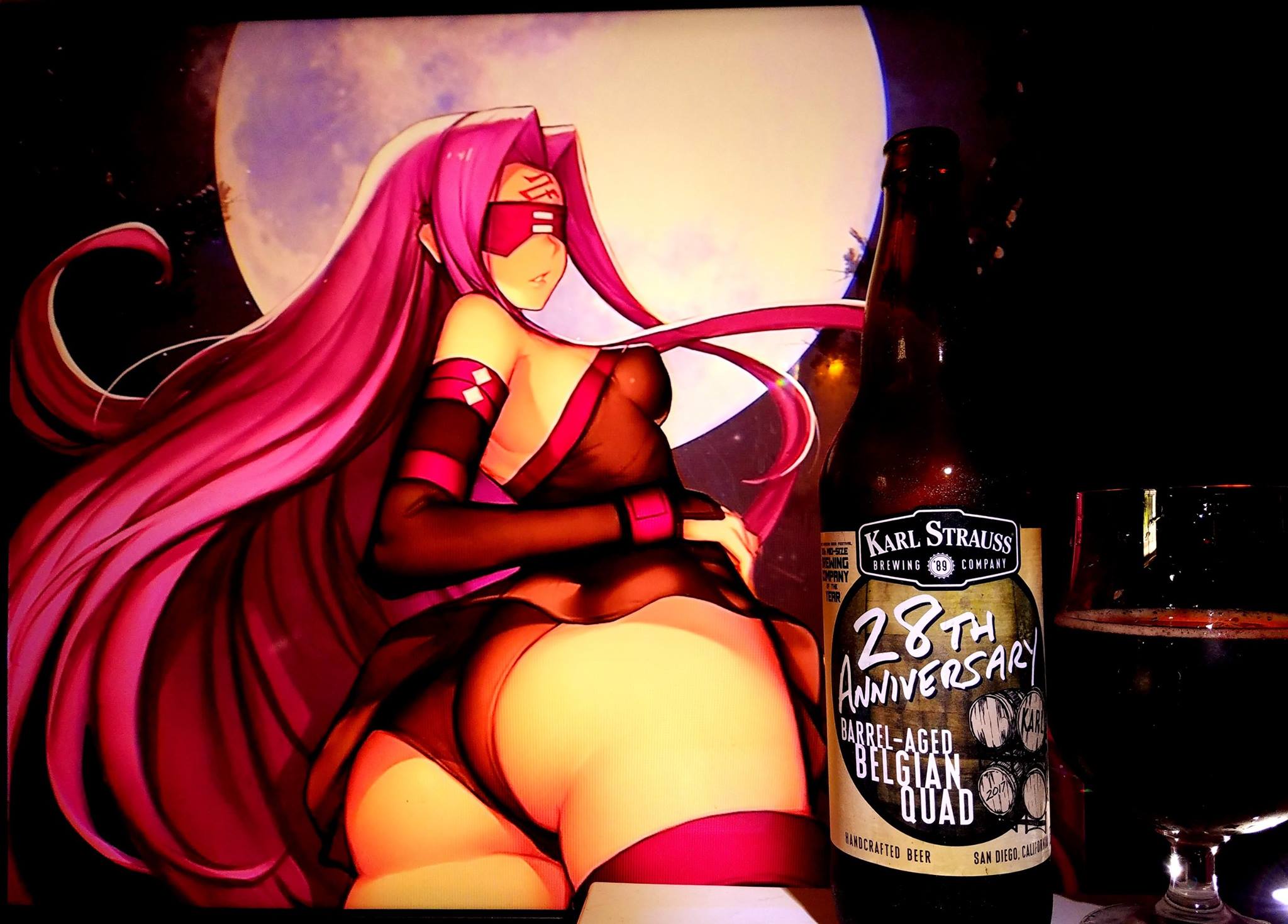 Rider from Fate Stay Night series was used in this pairing as I had used her in the previous Karl Strauss anniversary which I did not do a review of but this time around I wanted to bring her back. She represents the colors of the dark fruits which generally are a prominent flavor with these beers but also since she is powerful like the way this beer is strong in ABV. In general, the dark and barrel aged theme of the beer goes well with this one.