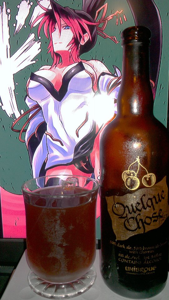 Quelque Chose by Unibroue is a Belgian style fruit ale at 8% ABV. 50% dark ale and 50% brown ale brewed with cherries. So this is a hybrid of a Dark Belgian with a brown ale fermented in the Kreik or Kriek lambic Style using the sour Morello Cherries. Made by the brewers that make the Trois Pistoles, one of the best beers in the world for me. All the stuff they make has never disappointed me. Yes it is French Canadian beers but I guess they know how to apply those old world wine processes into making some of the best beers ever. Limited time only, I found this one at Ramirez Liquor in East LA. Quelque Chose is the French for the word “Something”. If referencing something delicious, something mysterious or just something something darkside!!…LOL or just something sweet, then this is it right here. This beer reminded me of the Cuvee de Tomme from Lost Abbey but more sweeter and well less heavy. Ill be honest, this beer taste more like drinking Framboise but well it is more complex than that even. The taste is phenomenal!! Sweet cherry wine mostly with their awesome yeast which really gives that bread Belgian bread taste. Sweet caramel and vanilla are followed by nuts and apples like flavors. There is also this tart and tangy after taste but not like that of a sour beer. Wish I could have got 2 bottles, it is really good!!! So if your into sweet Belgian beers like Three Philosophers then go and try this one 😛