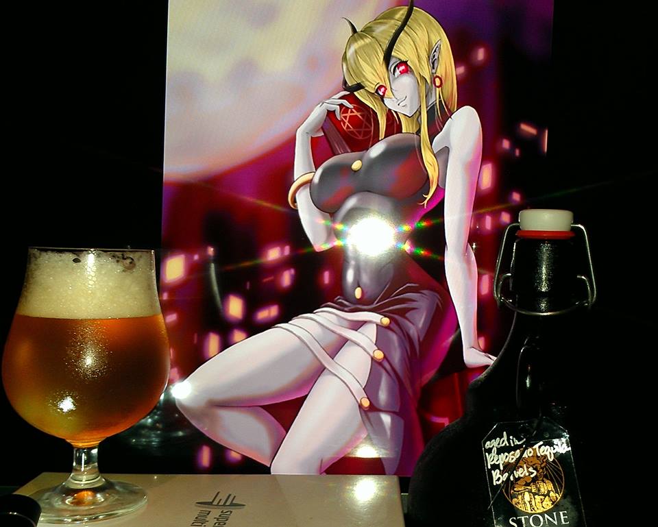 Jedah Dohma “Midnight Bliss” version from Darkstalkers/Vampire Savior was used in this pairing as with the last time I tried and reviewed the original brew, I used Jedah as well. This time, Jedah fermented in the dark recesses of Reposado tequila barrels represented by the mezcal and agave colors of the picture where she is with the deathly bird (Think of it as the Mexican Tequila influence and the Scythe being the harvester of Agave). I also brought back one of the original pics back too. Jedah for this stone beer represents the fancy tradition of European beers meeting the west coast. Meaning she has like a European Dracula like outfit but also blonde hair represents the aspect of the west coast style in terms of the blonde and clear colors that this beer has.