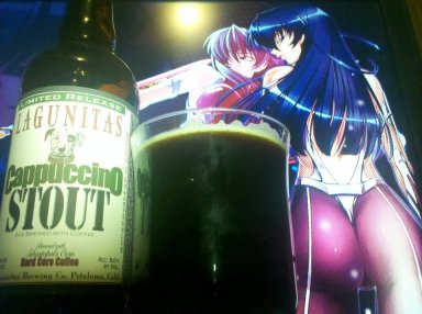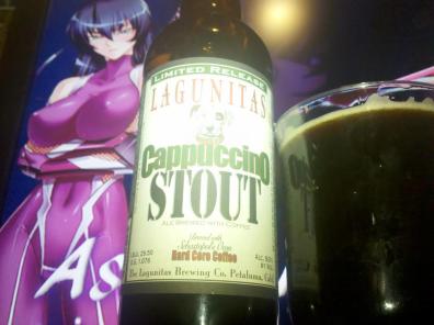 Another Limited Release….the Lagunitas Cappuccino Stout. It is an American Double/Imperial Stout.. It was another gift from my brother Martin… I had to explain this brew from many angles as dark like ninjas, its hard to catch on film, yet alone catch on taste and flavor how different this beer is from other chocolate/coffee stouts. To begin, This brew is made with Sebastopols Hard Core Coffee. LOL I don’t know about this but if this coffee/cappuccino is as bad as the ninjas…1 of 2 things will happen. Either I will be so jacked up on coffee I will not be able to sleep tonight due to the coffee/cappuccino in this…or I will have to stay awake so lovely ninja babes don’t kill me O.O….either way…as I sip this delicious reminder or Starbucks magic… I ponder to the many flavors it has to offer…Aside from the heavy shots of caffeine. This brew has chocolate/coffee/caramel/dark fruit like cherry/amaretto/molasses/soy sauce/wake the fuck up juice!!!…. I write this as I am very up for this beer and I am very hyped on its delicious flavors that keep making me want even more.*sip*…slowly…even though this is not your usual hot cup of Joe, it has to be taken into small portions as this is 9.0% ABV….no advise on how much caffeine…but I don’t really think it matters as this brew is definitely a wake up call to awesomeness… IF work would let me drink this instead of their nasty coffee which the pot is rarely clean and everyone always gets chunks of burnt roast and nasty rocks with every pour…then this technically would be the better choice in my opinion. A combination of staying alert and focused yet being relaxed and calm to relive stress and improve performance….. This reminds me of my days with mixing alcohol with red bull…but more moderate version. Definitely enjoyable and very very delicious. Lagunitas, is closer to becoming a favorite brewery of mines :3…Keep going guys..your guys are aweshum X3