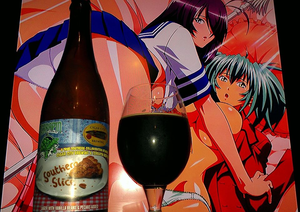 Kan’u Unchou, Ryofu Housen and Hakufu Sonsaku from Battle Vixens were chosen to represent the label of the beer as well as the flavors. Ryofu’s checkered dress and Kan’u’s Blue dress represent the background of the label colors. If I say, Kan’u is cigar city because of the yellow ribbon and long spear and Ryofu is Terrapin because of her green hair, then we can assume both of them together give breed Hakufu which has the orange brown hair to represent the vanilla and pecans as shown in the second picture. You can also say Kan’u’s hair is the dark fruits implied in the flavors as well as Hakufu’s colors and Ryofu’s crimson suit to match that of the fruit cake, spices and maple. Yes it is kind of a stretch but that’s what I got. Any other things you can see here?