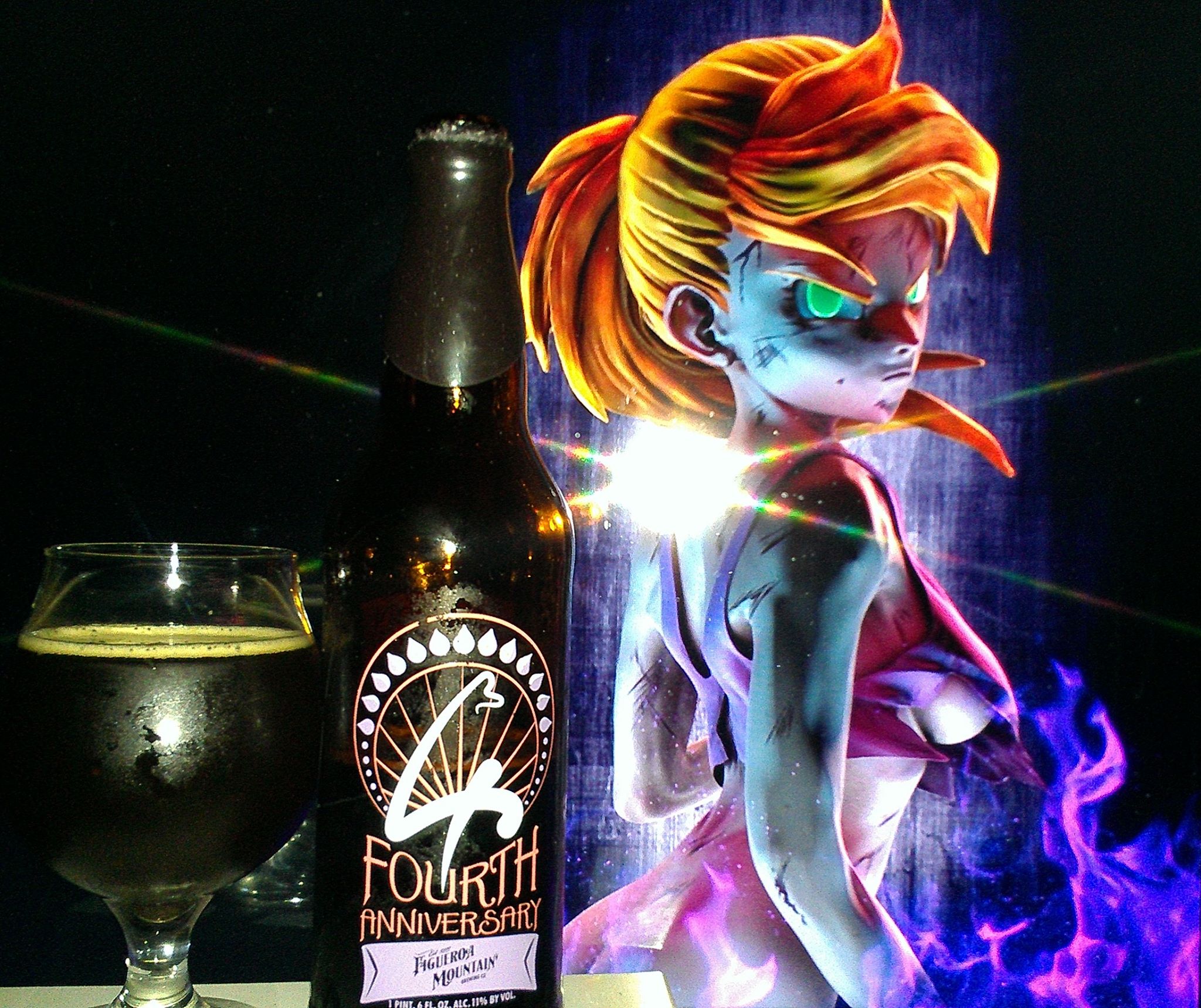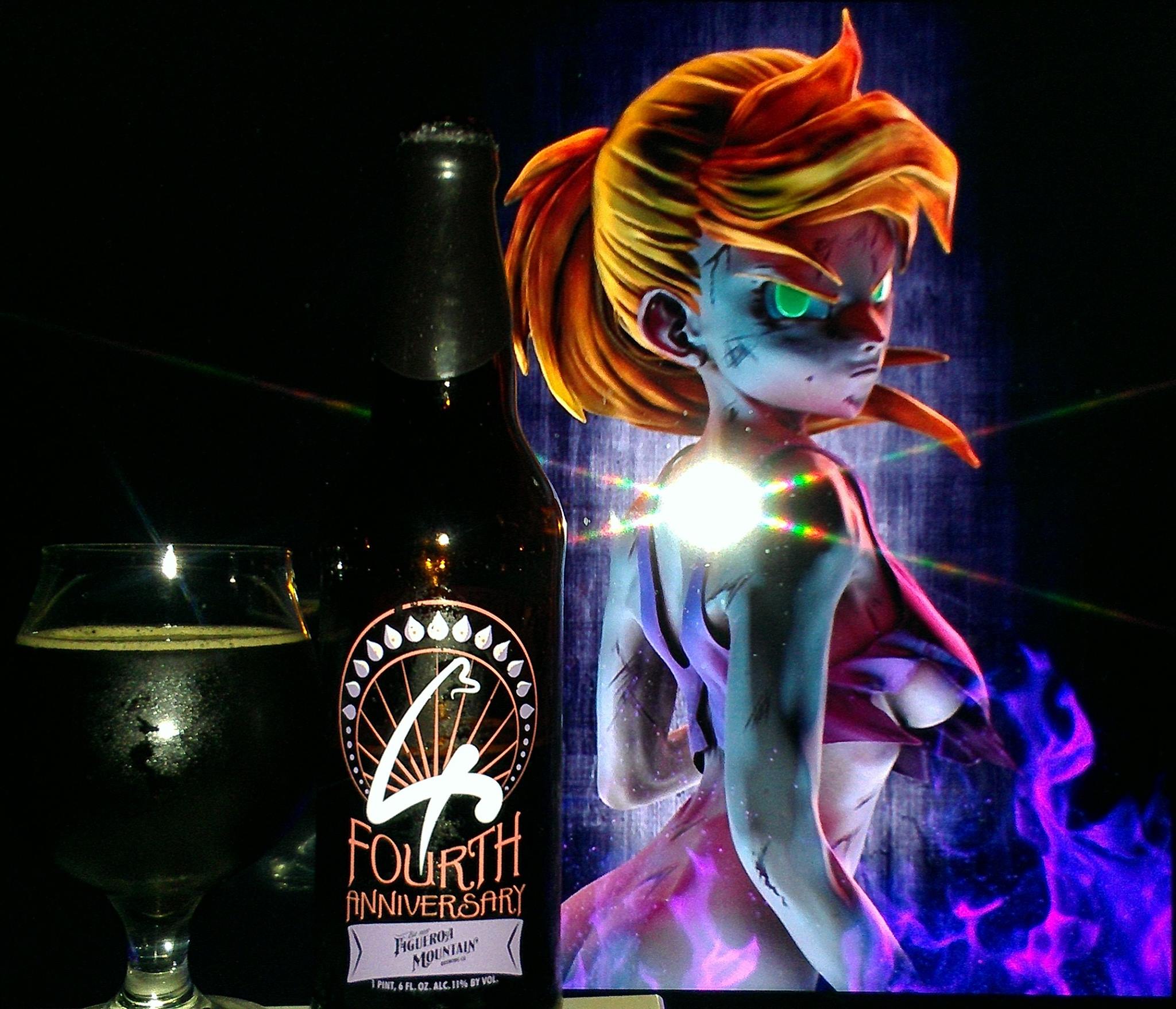 4 Fourth Anniversary by Figueroa Mountain is an 11% ABV Belgian Quadrupel brewed with figs and aged in oak barrels.