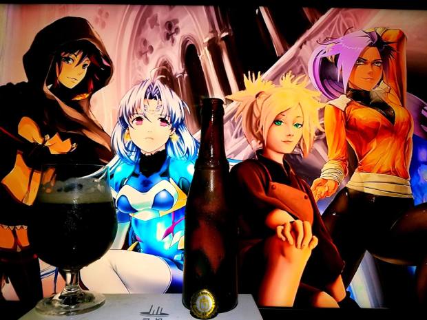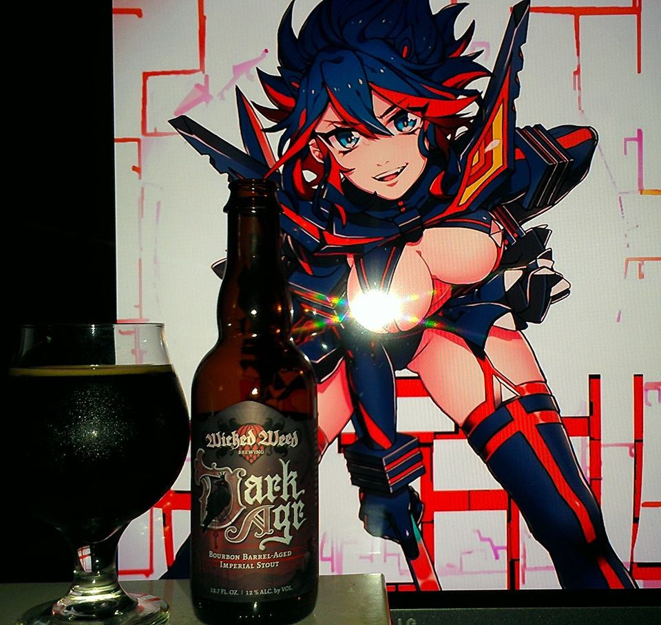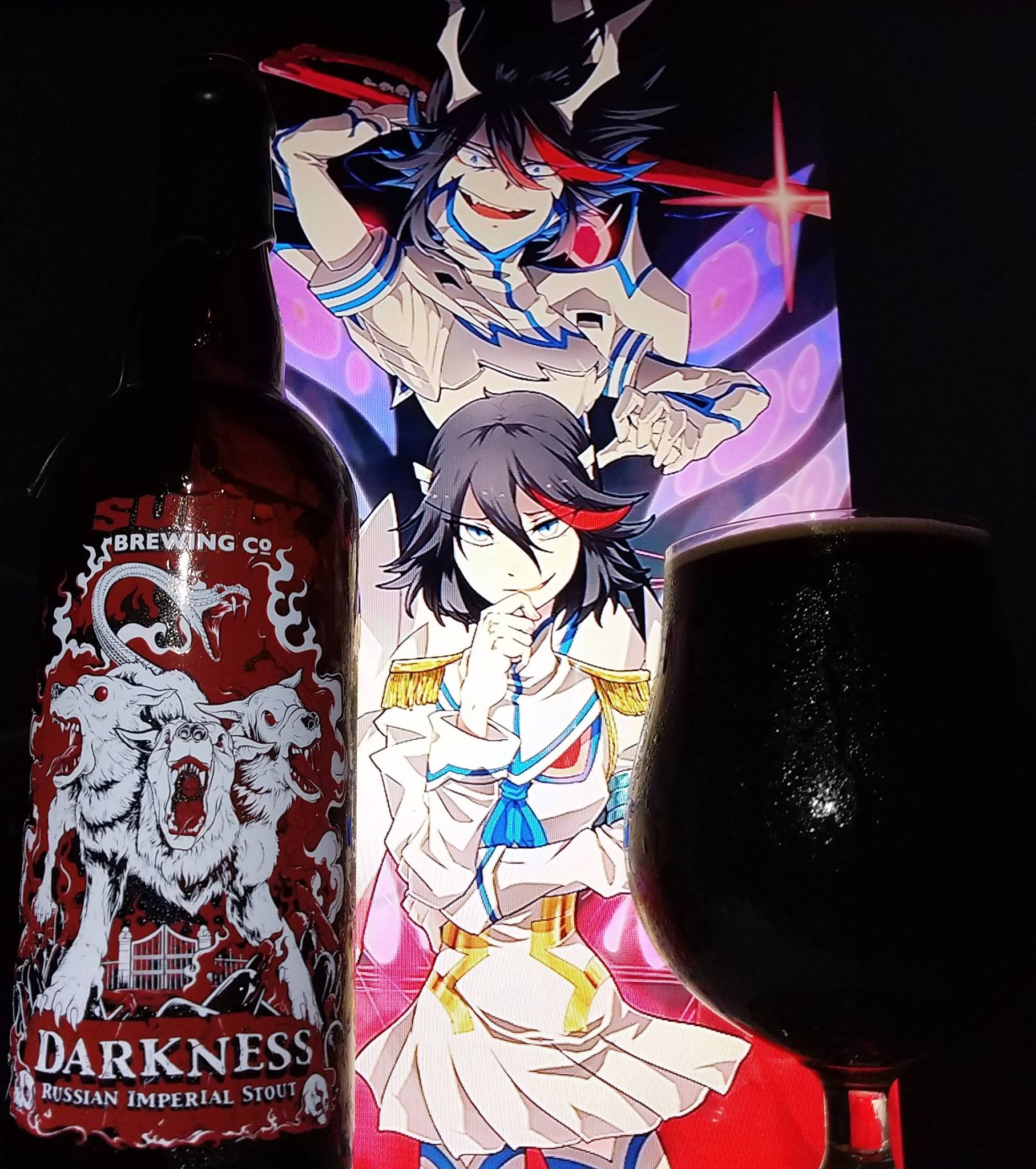 Yoruichi Shihouin (Right) and Ryuko Matoi (Left) from Bleach and Kill La Kill were chosen in this special pairing to compliment the label (Yoruichi hair), the complexity of flavors (Ryuko with cherries and blueberries, dark fruits in her eyes, Yoruichi with orange and spices in her eye colors, hair and speaks of dark fruit raisins), the strength of ABV (Both supremely strong female characters), My favorite style, Quadrupel (2 of my favorite characters), Smooth but dangerous (Both travel at the ridiculous high speeds and attack without mercy if their friends are in danger), very warming and satisfying beer (Very caring and kind hearted despite Ryuko always being the tough girl and Yoruichi, well always being alluring). There are more things I can definitely say as to why it fits this beer, but I will leave it to you to see what else you think works great in this pairing.