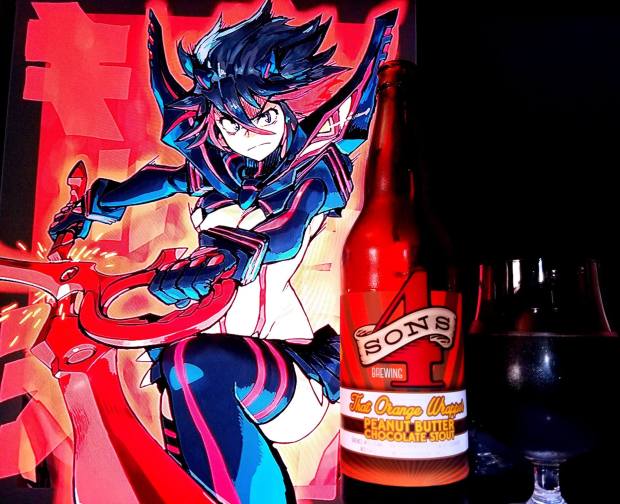 That Orange Wrapper by Four Sons Brewing is an 8.6 % ABV Imperial Stout brewed with peanuts and chocolate.
