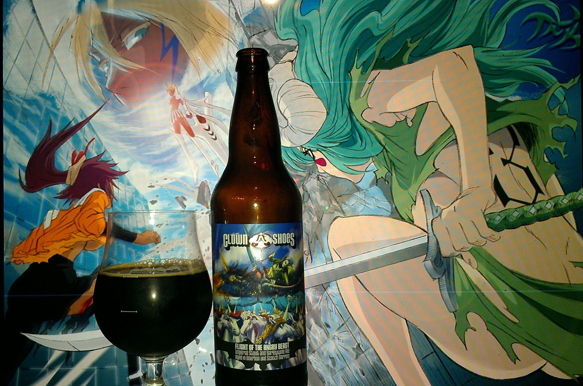 Flight Of The Angry Beast by Clown Shoes is a 10.75% ABV American Strong Ale consisting of an Smoked Imperial Stout brewed with Holy water aged in bourbon barrels, a Scotch Barrel Aged Russian Imperial Stout and an English Style Barley Wine aged in Scotch. Another Cuvee of dreams!