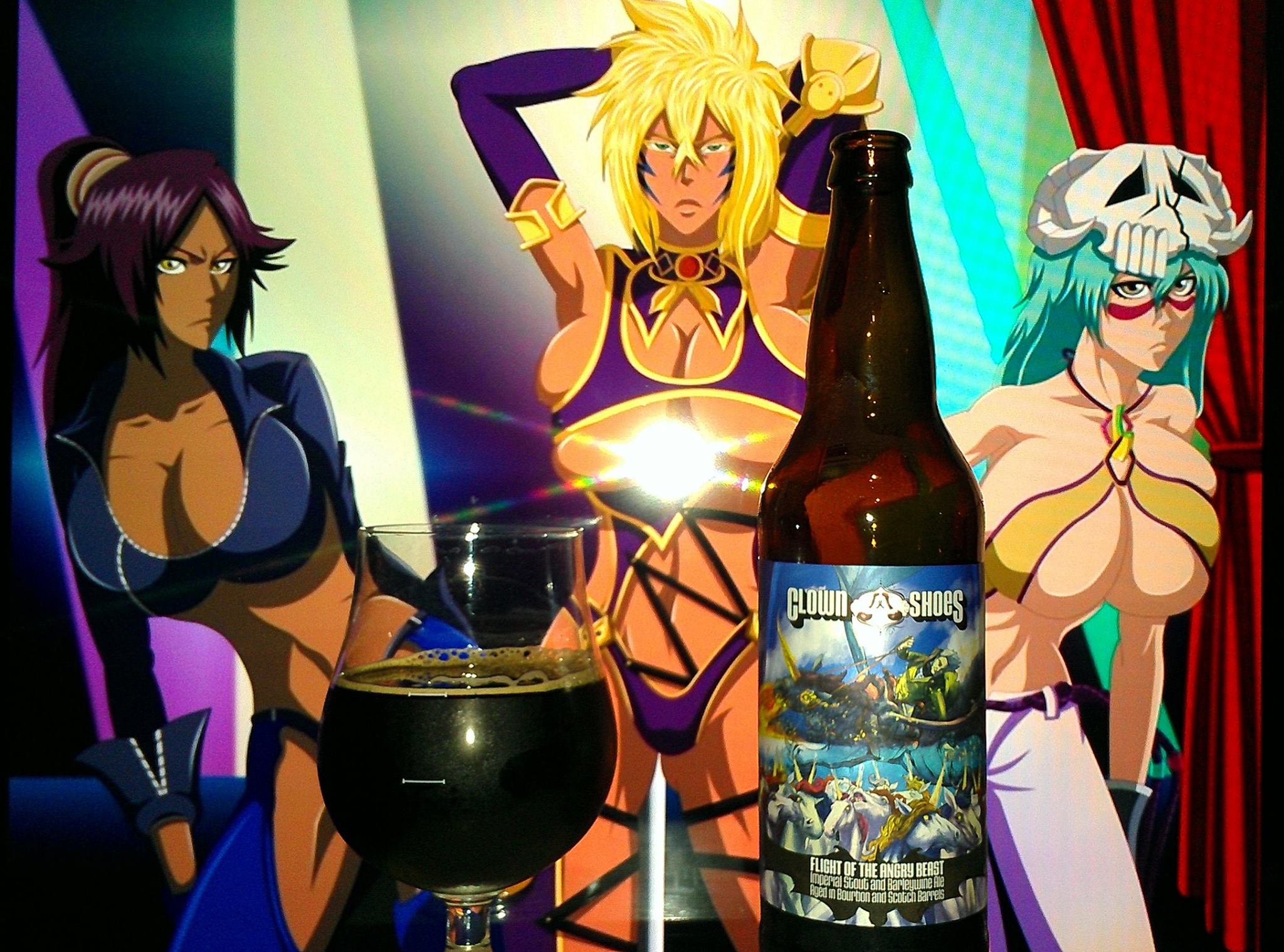 Tia Harribel, Nelliel Tu Odelschwanck and Yoruichi Shihouin from Bleach have always represented some aspect of the clown shoes beers in my past reviews. Tia is the Undead Party Crasher/Vampire Slayer. Nelliel has always been the original Unidragon and Yoruichi would be added for good measures since the Porcine Unidragon came out. The blend of each beer together and the unleash of the Extremely Angry beast can be best represented when all three together are looking like bad asses powering up to team up against great foes. The strength and complexity has come together very epically that I could not think of any other pairing artwork that would be the best representative of this beer.