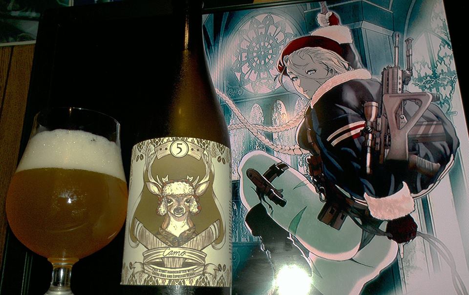 Camo by Five Stones brewing of Cibolo Texas is a 7.8% ABV Golden/Pale Stout brewed with Cocoa Nibs and Espresso Beans.