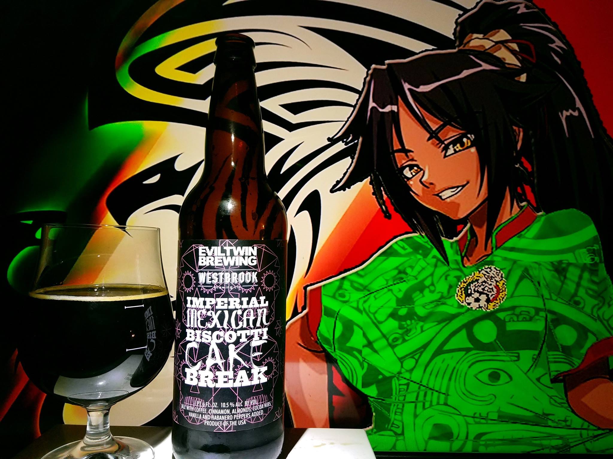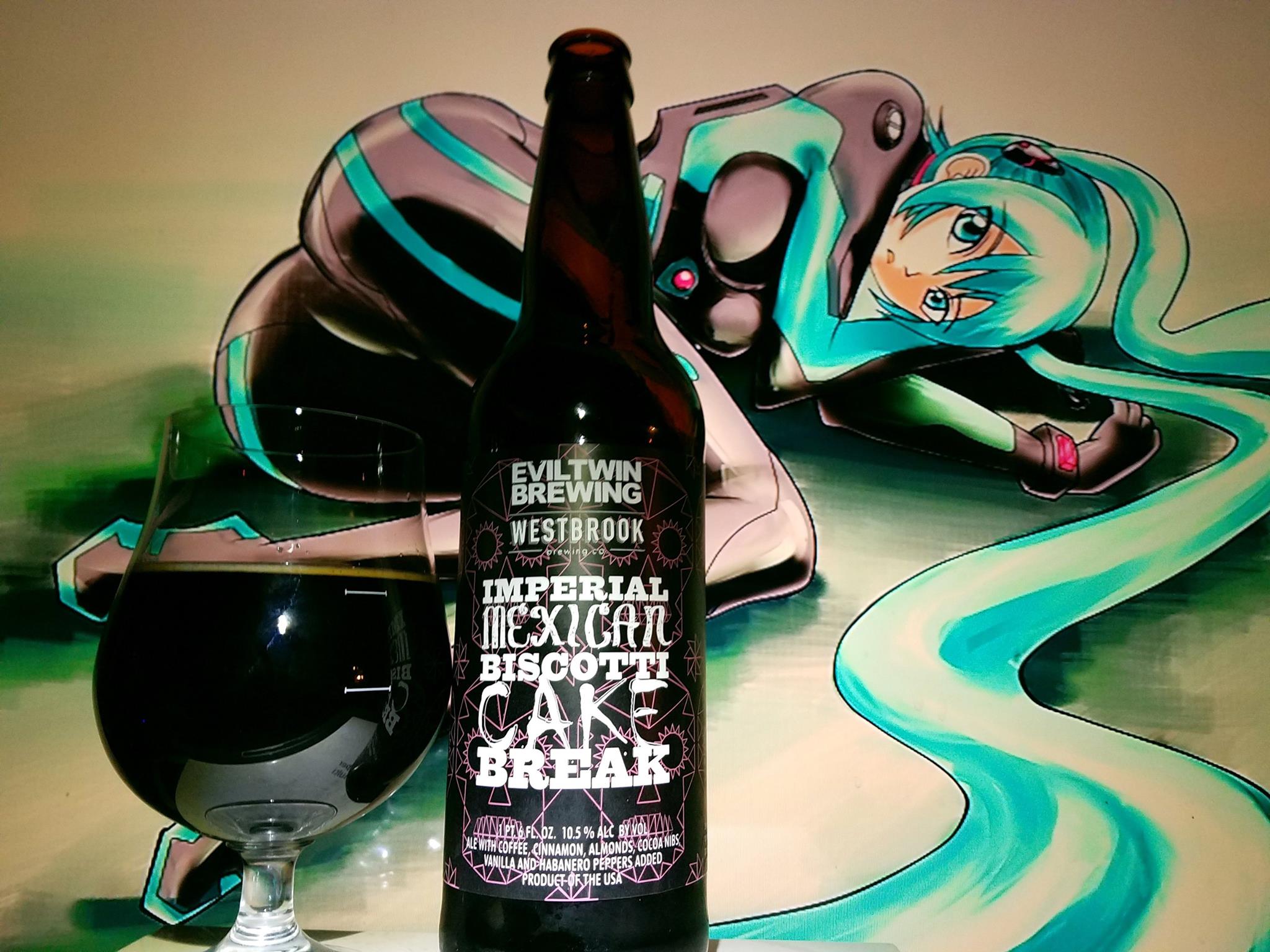 Imperial Mexican Biscotti Cake Break collaboration by Evil Twin Brewing and WestBrook brewing is a 10.5% ABV Imperial Stout with Coffee, Cinnamon, Almonds, Cocoa Nibs, Vanilla and Habanero peppers added.
