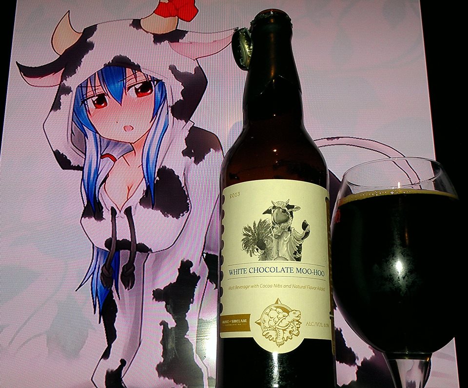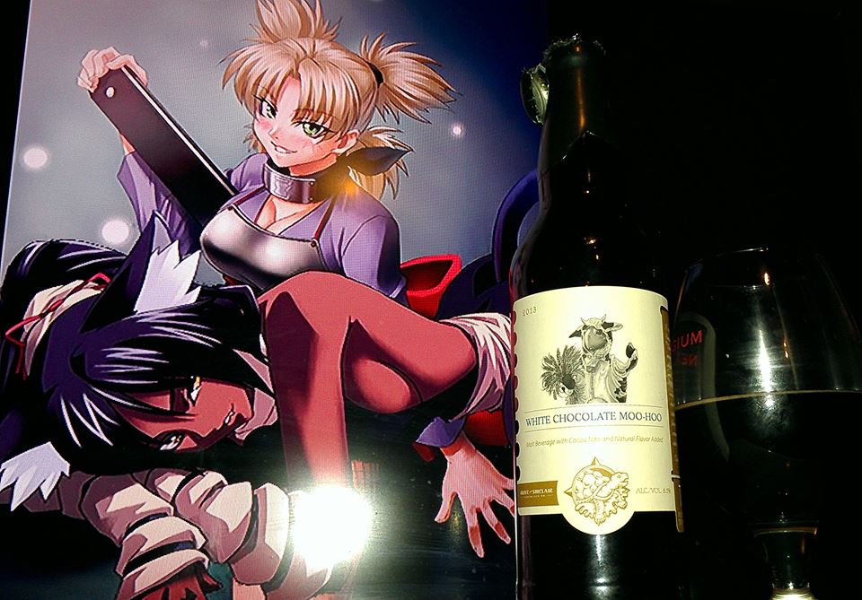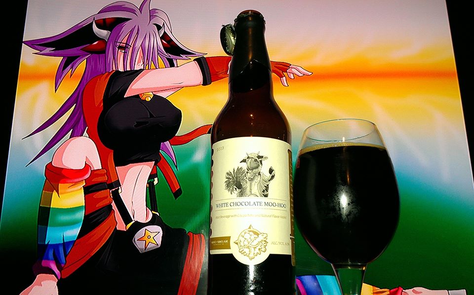 Temari and Yoruichi from Naruto and Bleach prospectively are both ninjas and two of my most favorite anime characters ever alongside with KOS-MOS of Xenosaga. I used this art work to pair the White and Dark Chocolate aspects of the beer. The Ying and Yang if you will. You also see this in my reviews for Chocolate Rain and Bruery’s White Chocolate as well. Not only using them because they fit, but mainly because they are my favorite characters and paired with my favorite beers. You may find that a lot throughout my reviews, especially the 6/5 or even the Melange 7/5 rating. Either way, the artwork fits. Temari and her summon, Katamari, the weasel I used to represent the separate aspect. This is a White Chocolate beer and she has a while weasel that is Black and white. The cow pictures I used are mainly to represent the cow suit the Terrapin mascot wears in the label. Seeing as this is a Milk Sweet Stout. The last one with the purple cow is used to represent the flavors of the beer are like all the colors of the rainbow and she looks bad ass too. So it fits in my perspective of creativity.
